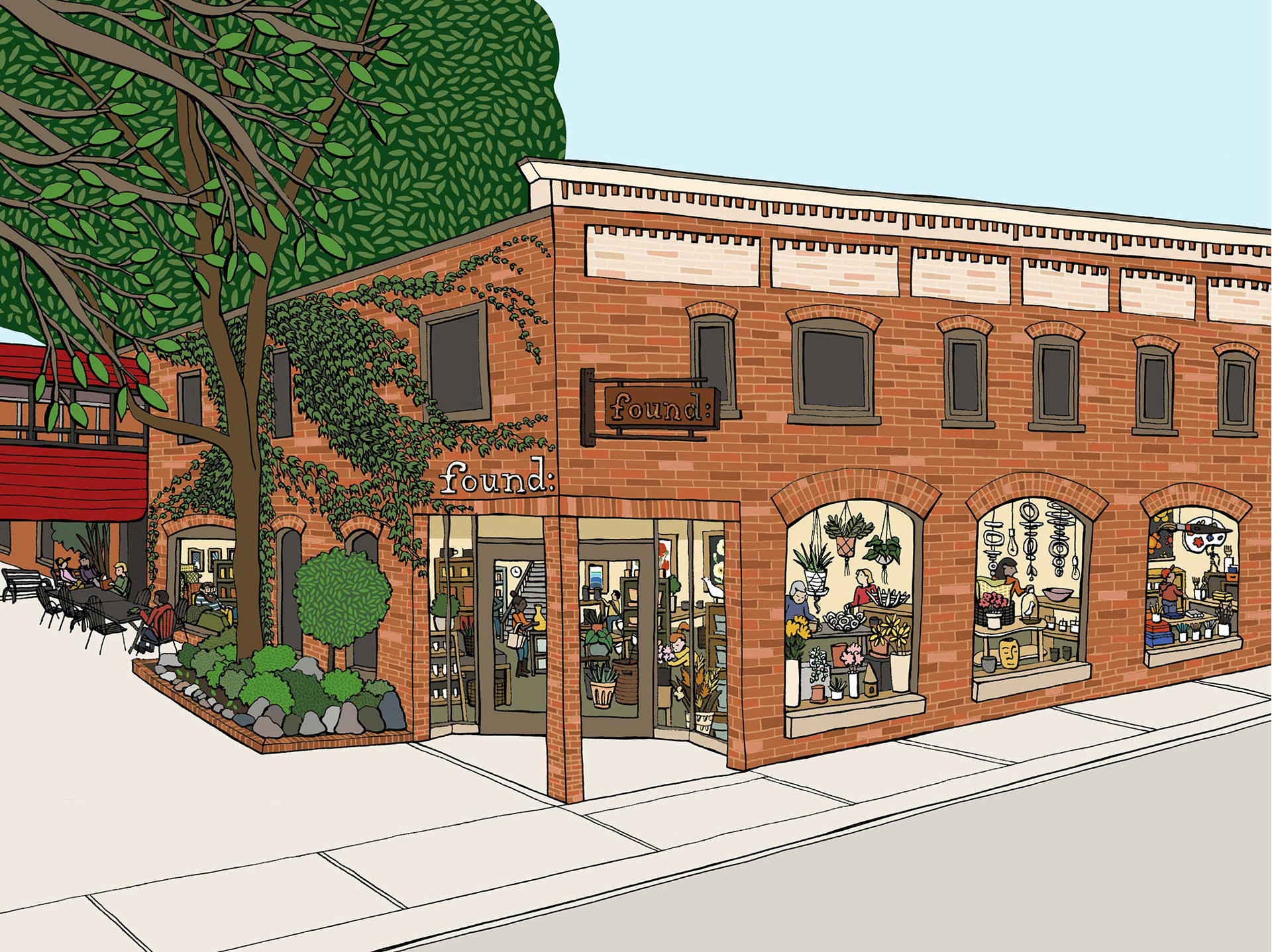 Custom storefront illustration to commemorate twenty years of Found Gallery in Kerrytown, Ann Arbor, MI.